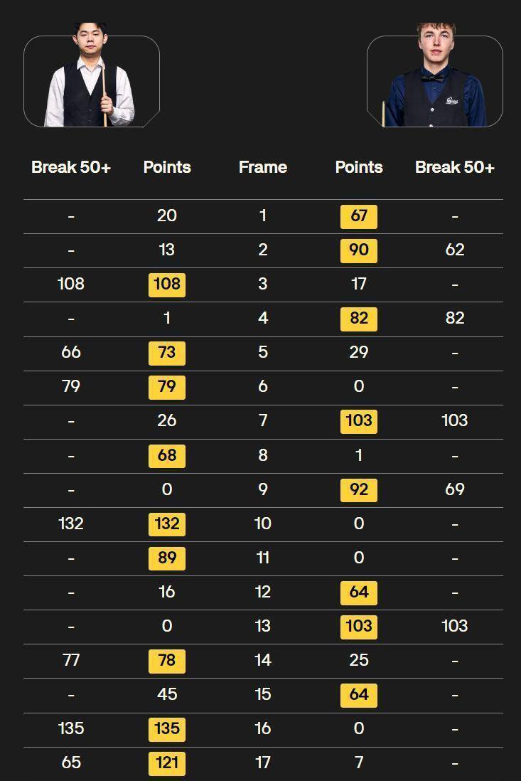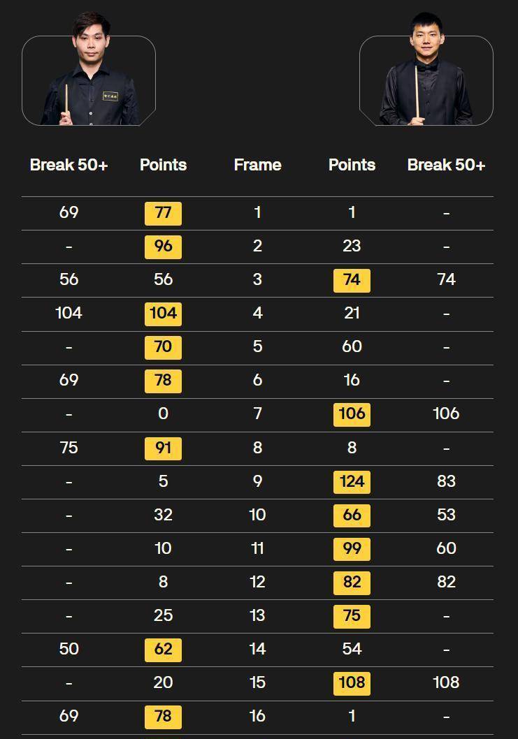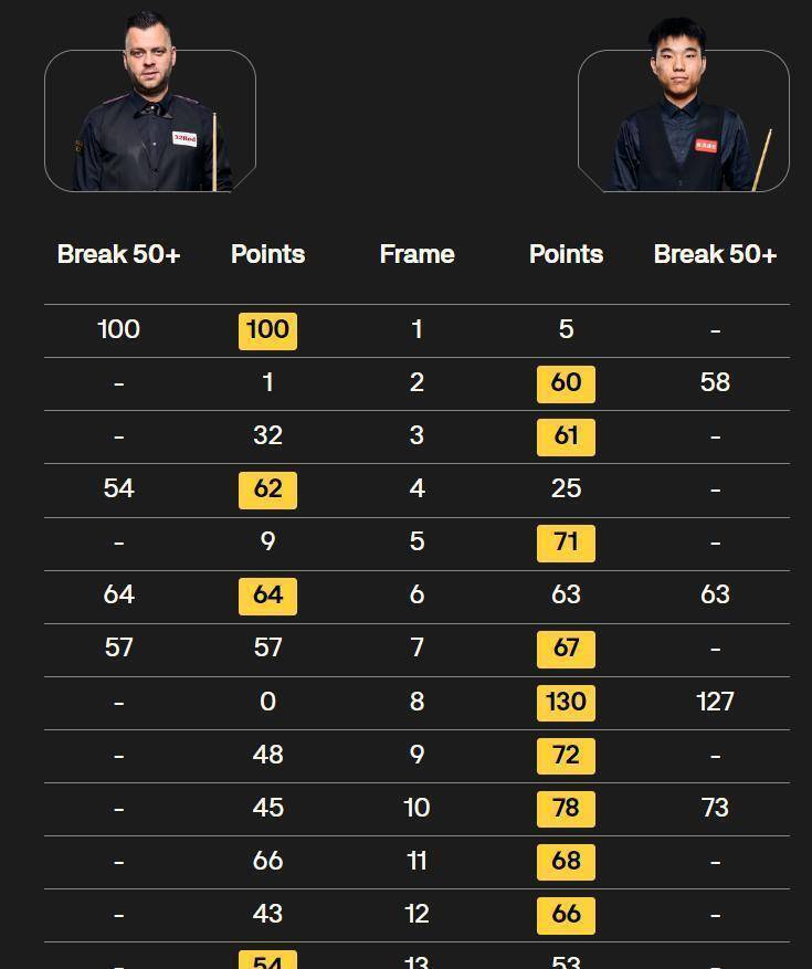 常冰玉的147分是一个缩影。 它展现了极致的个人技艺,却无法单独兑换一场胜利。 斯诺克比赛,尤其是长局制的世锦赛,稳定性与把握机会的能力往往比一两杆神来之笔更重要。 范争一战胜罗伯逊的比赛,数据接近而比分悬殊,背后是围绕彩球处理的细微差别和关键局分的掌控。